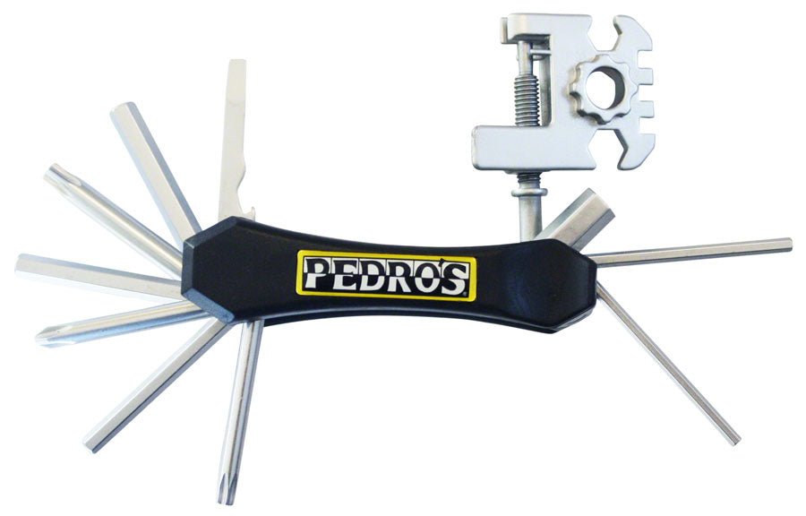 Pedros ICM-21 Multitool. The new ICM-21 adds new tools including a 1-12 speed chain tool a Shimano Hollowtech crank cap tool and 7 & 8mm flare wrenches for disc brake fittings all while dropping 15 grams of weight. The ICM-21 features tools made from heat-treated tool steel for strength superior anti-corrosion finish for unmatched lasting performance a body made of lightweight but super tough composite material and two full-function tire levers.220 gram 21-function folding multi-tool with 2.5 3 4 5 6 & 8mm hex T25 & T30 Torx #2 Phillips & flat blade screwdrivers 1-12 speed chain tool 2 tire levers 7 & 8mm flare box wrenches 3.23 3.3 & 3.45 spoke wrenches bottle opener Shimano crank cap tool and presta valve core tool